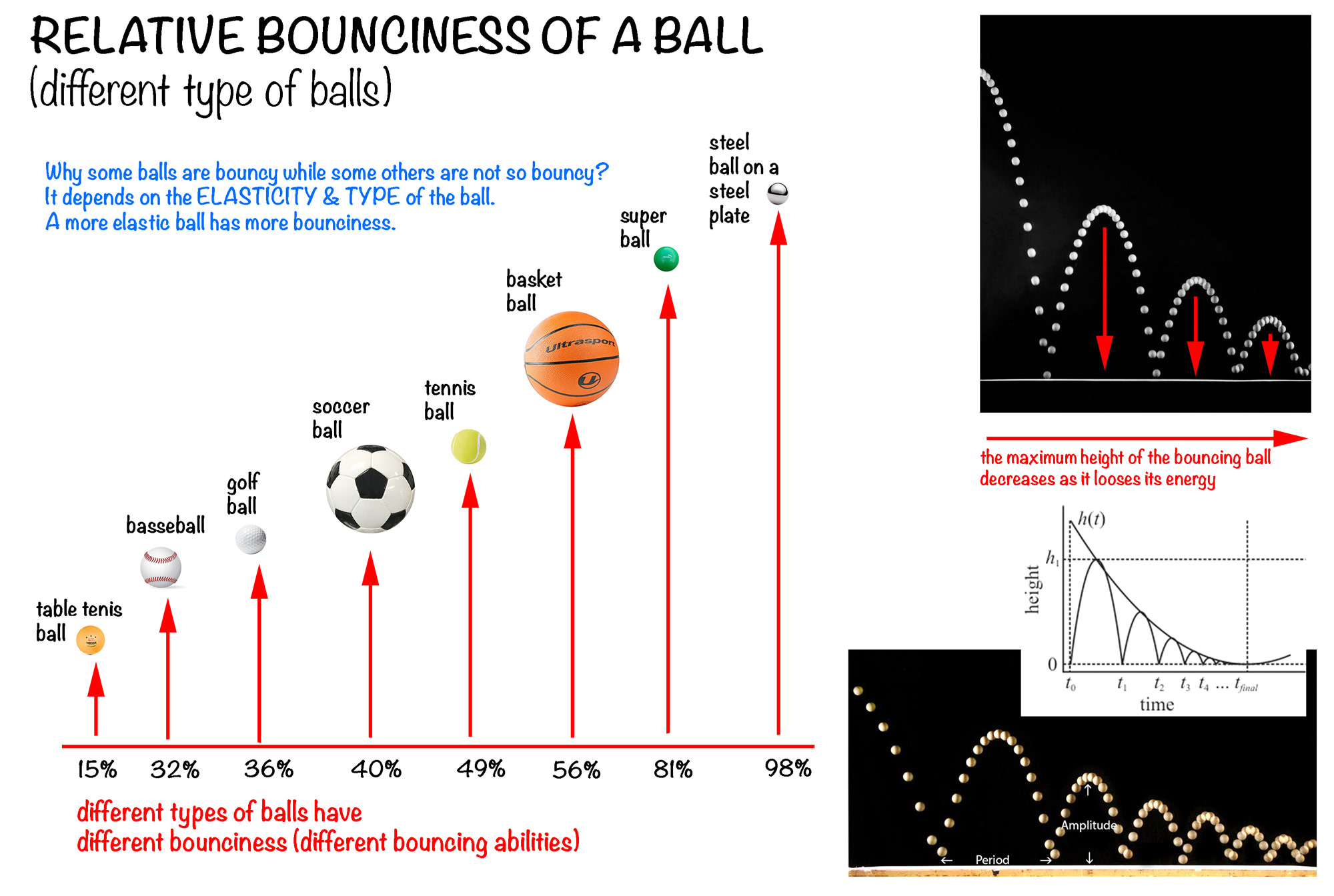 - Initial bounce: The first bounce-back of a dropped ball always reaches a height lower to its initial drooping-height. This is also the highest accumulation energy the ball has and with each contact, the ball loses its energy due to friction with the contact surface.