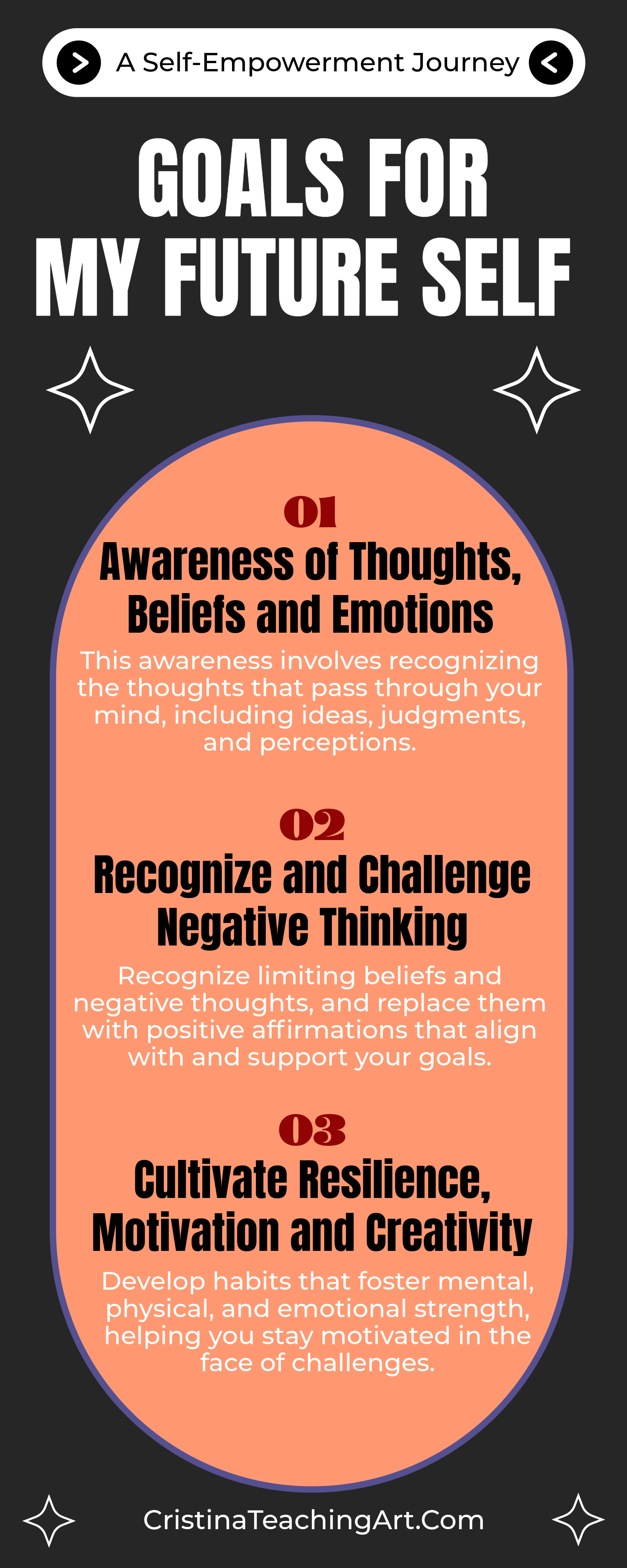 Identify limiting beliefs and unhelpful thought patterns. Learn how to reframe them into positive, supportive affirmations that align with your goals and personal values. - Cultivate Resilience, Motivation, and Creativity